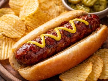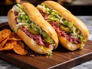 On a Sourdough roll, pickles, mustard and lettuce served with BBQ chips