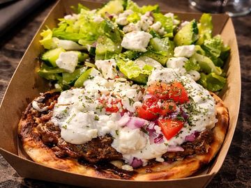 Turkey Meatballs on a pita, homemade Tzatziki sauce, tomatoes, onion, feta and side salad