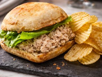 Albacore Tuna, mayonnaise, pickles, red onion, and apple mixed together on a toasted ciabatta served with chips