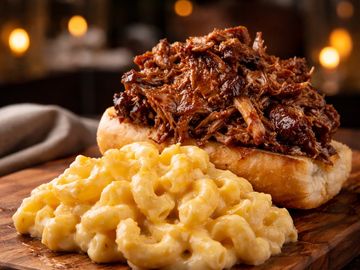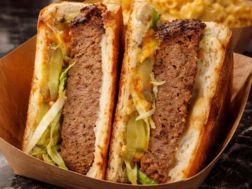 On a sourdough with havarti cheese, mustard, ketchup, pickles, lettuce served with mac n cheese