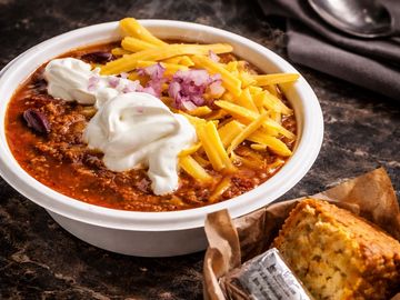 Beef and Turkey Chili Served with Cheddar Cheese, Onion, Sour Cream and a homemade cornbread muffin