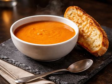 Bowl of Tomato Bisque served with a slice of toasted sourdough crostini