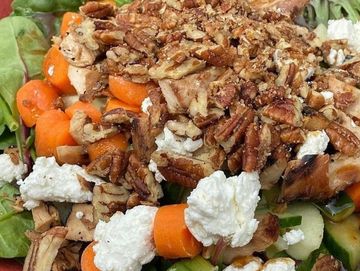 Grilled Chicken on Mixed greens, cucumber, carrots, apples, candied pecans and goat cheese with a Balsamic Maple Vinaigrette